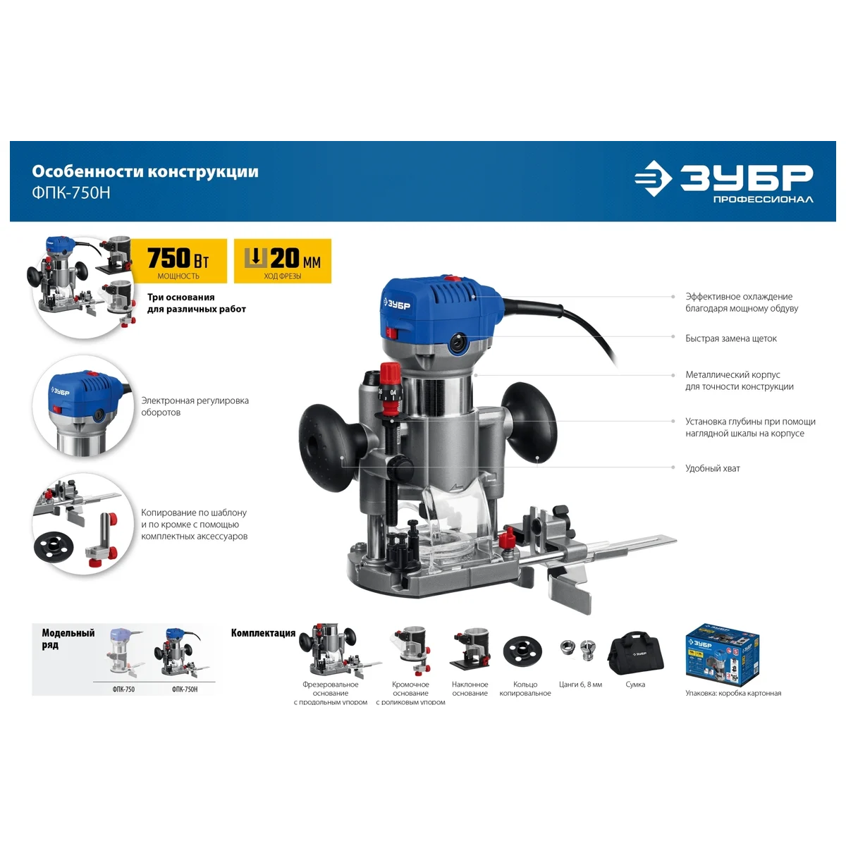 Технические характеристики ЗУБР профессионал ФПК-750НМощность750 ВтРазмер цанги6; 8 ммМах размер цанги8 ммMax диаметр фрезы30 ммРабочий ход фрезы20 ммКоличество фрез в комплектенетMax число оборотов33000 об/минРегулировка оборотовдаПлавный пускдаПоддержание постоянных оборотов под нагрузкойдаВстроенный патрубок пылеотсосадаПараллельный упор в комплектеестьНаличие микролифтанетГабариты без упаковки340x230x200 ммВес нетто1.8 кгУровень шума99.8 дБЧисло оборотов13000-33000 об/минКомплектациясумкаНаличие подсветкинет