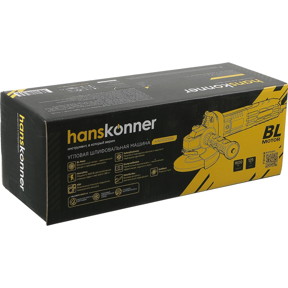Угловая шлифовальная машина Hanskonner HAG9125SB — мощный и компактный электроинструмент для шлифования и зачистки поверхностей, а также резки металлов, кирпича, керамики или камня без использования воды. Данная модель имеет бесщеточный электродвигатель мощностью 1600 Вт и фирменные японские подшипники NSK, что повышает продуктивность и рабочий ресурс. Также, ресурс инструмента, подкреплен герметичным выключателем, функцией плавного пуска и защитой от перегрузки двигателя.