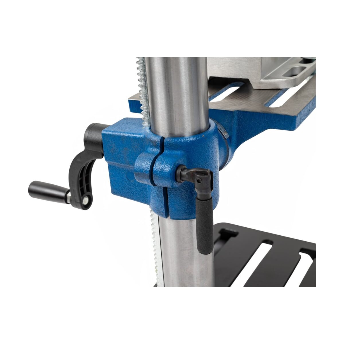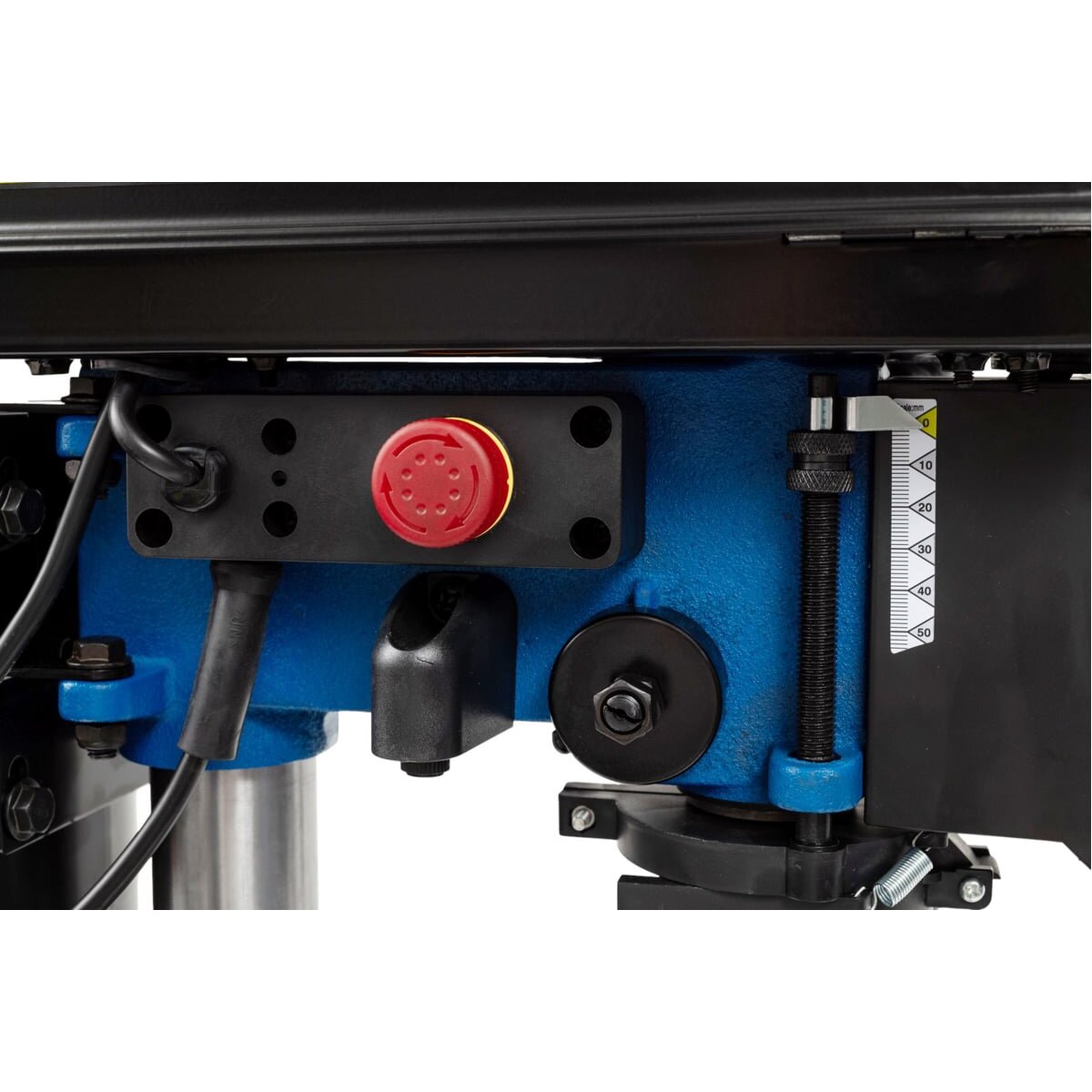 Сверлильный стол из прочного чугуна регулируется по высоте (макс. 305 мм до патрона). Наклон стола по шкале от 45° до -45° позволяет выполнять отверстия под углом. Максимальный ход сверла — 50 мм.