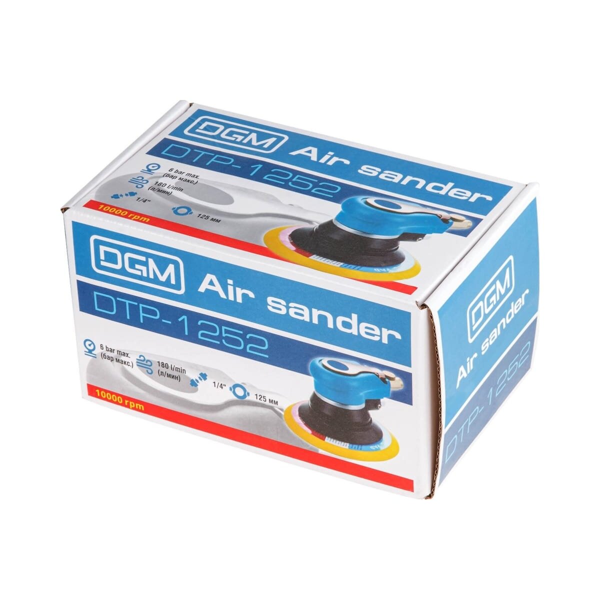 Пневмошлифмашина эксцентриковая DGM DTP-1252 с эргономичным дизайном. Скорость вращения 10000 оборотов в минуту, имеется регулировка скорости. Расход воздуха 180 литров в минуту.Технические характеристики DGM DTP-1252Тип инструменташлифмашинаТип соединениярапид (EURO)Диаметр диска125 ммАмплитуда колебаний5 ммЧисло оборотов10000 об/минMax число оборотов10000 об/минЧастота колебаний10000 кол/минУпаковкакоробкаДавление5.92 атмРасход воздуха180 л/минДиаметр воздушного штуцера1/4F дюймКласс товарабытовойГабариты без упаковки215х130х120 ммВес нетто1.08 кг