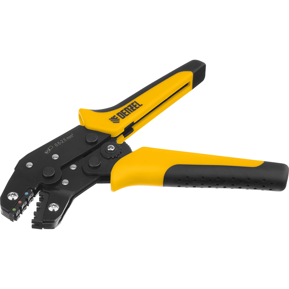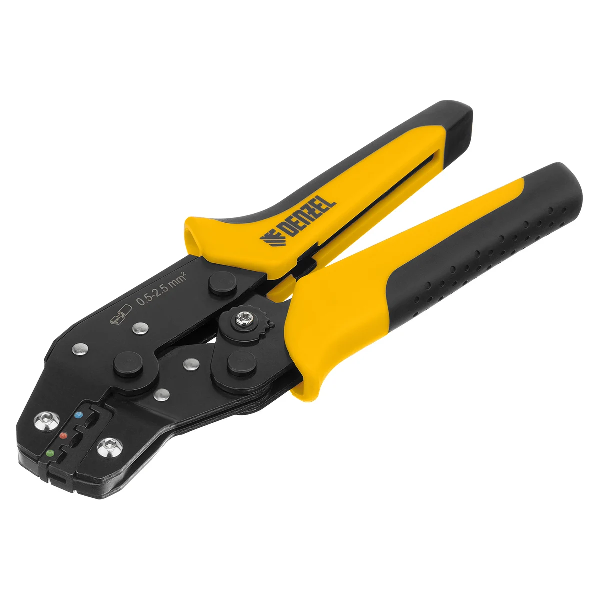Клещи Denzel 17747 предназначены для обжима изолированных кольцевых наконечников НКИ и вилочных НВИ, разъемов плоских РПИ, гильз соединительных ГСИ сечением 0,5-2,5 мм². Инструмент пригодится частным и профессиональным мастерам при проведении электромонтажных работ.