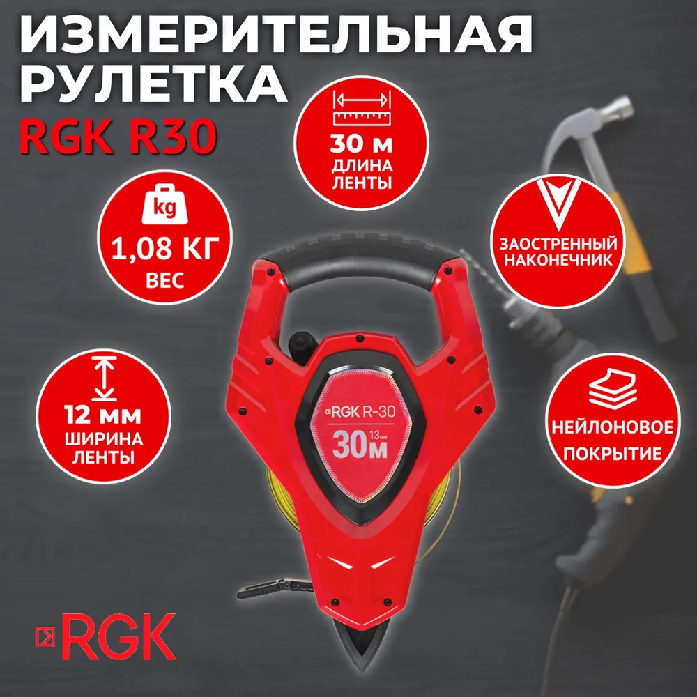 Измерительная рулетка RGK R-30 с нейлоновой лентой длиной 30 м. выполнена в открытом корпусе и снабжена механизмом ускоренного сматывания ленты. Нейлоновое покрытие ленты защищает ее от истирания.