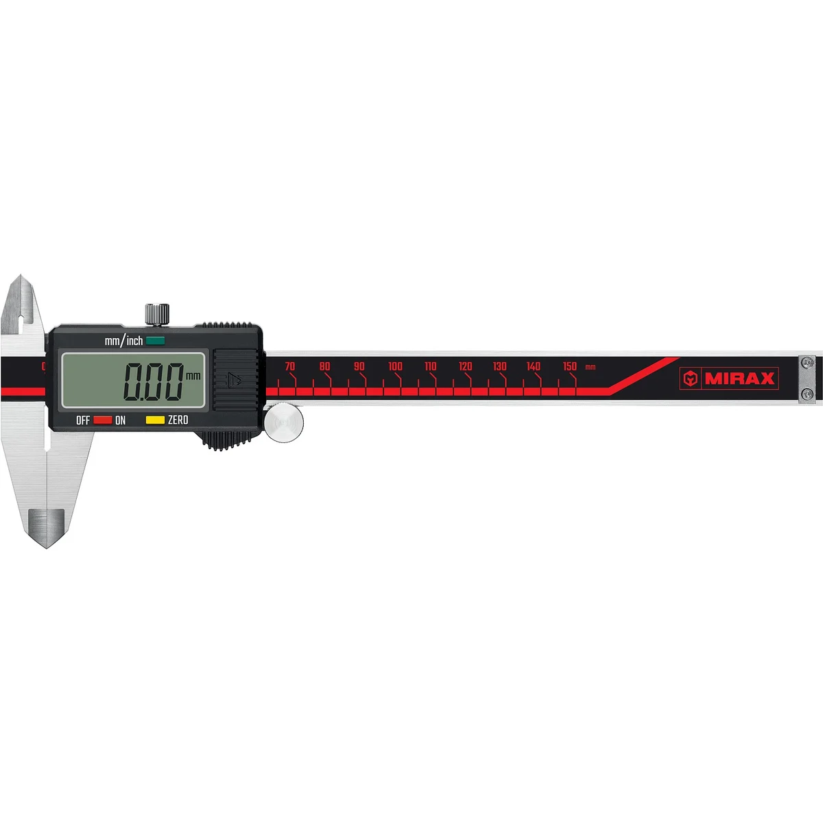 Штангенциркуль цифровой с глубиномером MIRAX 34413-150, предназначен измерений наружных и внутренних линейных размеров, а также для измерения глубин.
