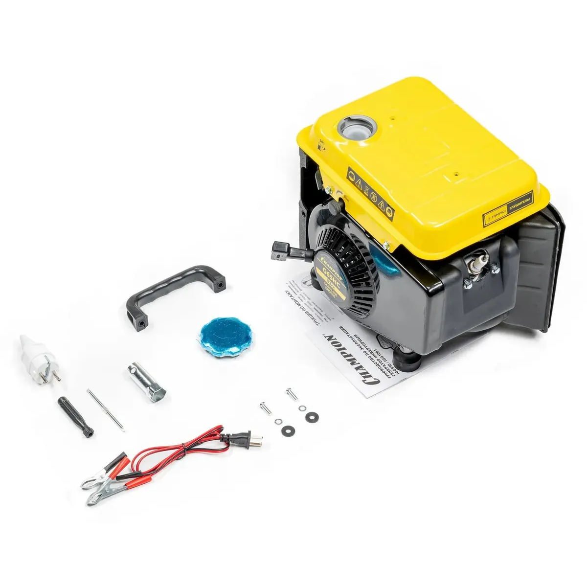 Генератор, крышка топливного бака, рукоятка траспортировочная с крепежом, отвертка, ключ свечной, вилка кабельная, кабель с зажимами для зарядки внешнего аккумулятора, руководство по эксплуатации.