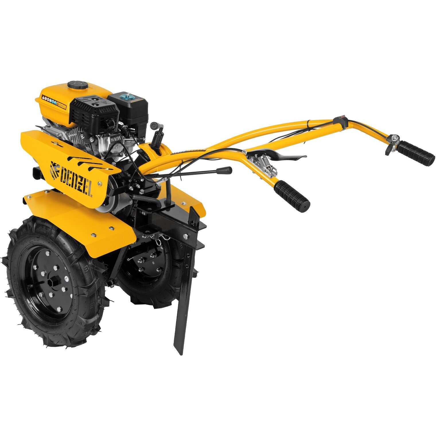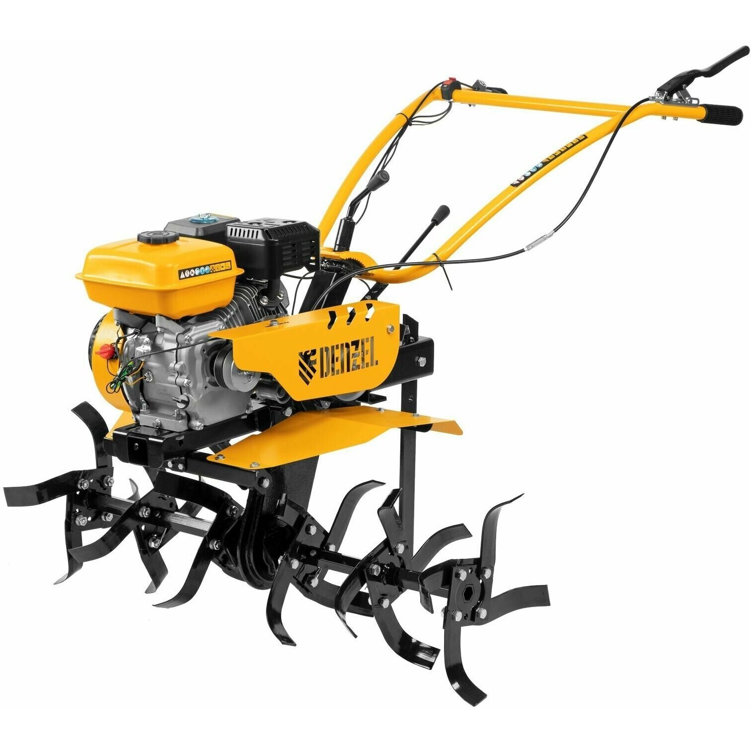 Мотоблок Denzel DPT-270S 56442 с двигателем объемом 212 см3 и мощностью 7 л. с, ременным механизмом сцепления, фрезами 3 х 4, шкивом отбора мощности (ШОМ) и коробкой передач 2В/1Н предназначен для проведения сельскохозяйственных работ.