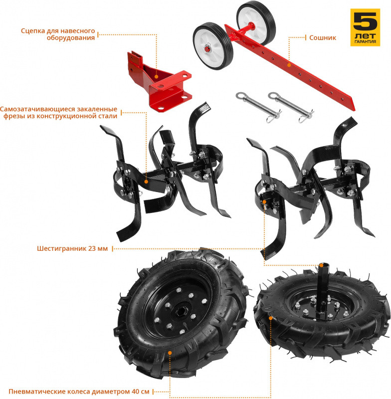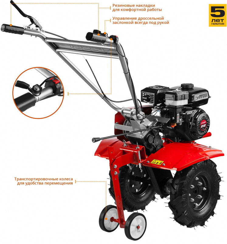 Описание: Надёжный и манёвренный мотоблок для рыхления и культивации почвы на приусадебном участке. Эффективный двигатель с воздушным фильтром в масляной ванне увеличивает моторесурс. Складываемые, регулируемые по положению рукоятки и транспортное колесо облегчают эксплуатацию, транспортировку и хранение.