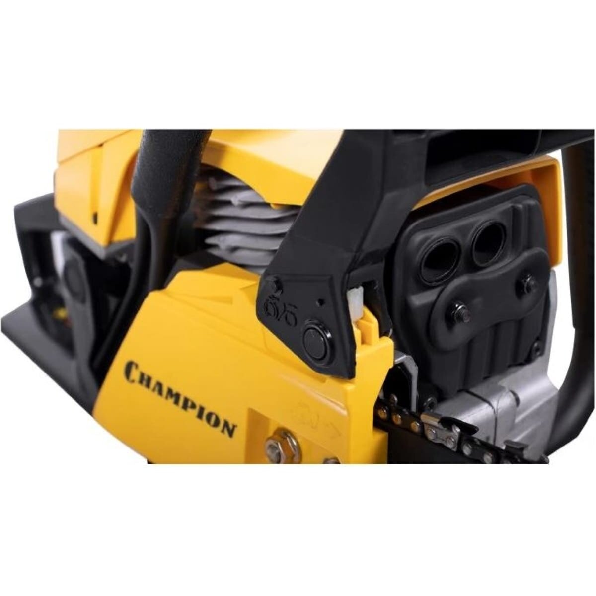 У цепи пилы профессиональный шаг 0,325 дюйма под широкий паз 1,5 мм. Бензопила Champion 251-18 оборудована подогревом карбюратора, позволяющим эксплуатацию при отрицательных температурах. В основании пильной шины есть стальной зубчатый упор, упрощающий распиловку бревен больших диаметров. Подача смазывающего масла на шину и цепь производиться автоматически посредством металлического насоса. Двигатель бензопилы работает на смеси двухтактного масла с бензином в пропорции 1 к 50.
