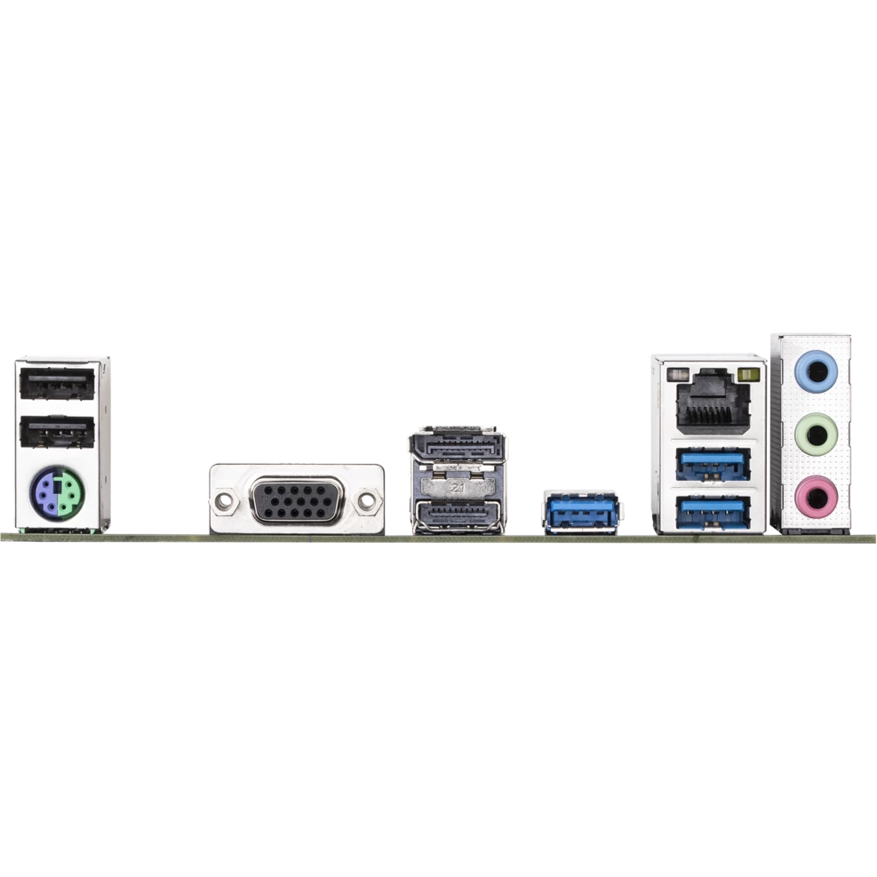 PS/2, 2 x USB 2.0, 3 x USB 3.2 Gen1, VGA, HDMI, DisplayPort, RJ-45