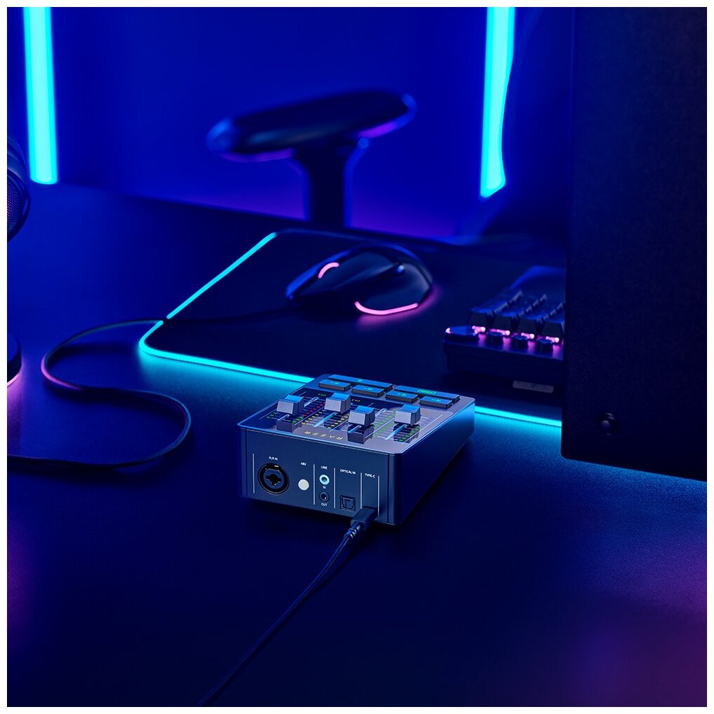 Razer Chroma RGB для всех кнопок (кроме кнопки фантомного питания 48 В), возможность настройки числа каналов и уровня громкости в Razer Synapse.
