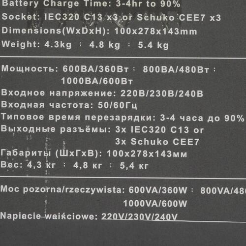 Powercom Raptor RPT-800A использует однофазное входное напряжение. Активная и полная мощности данной модели – 400 Вт и 800 ВА соответственно. Напряжение, которое выдерживает этот ИБП, колеблется от 160 В до 275 В. Диапазон частот тока – 40-70 Гц. Время полной зарядки батареи составляет 4 часа. Есть возможность простой замены неисправного аккумулятора без обращения в центр сервисного обслуживания.