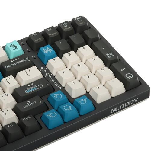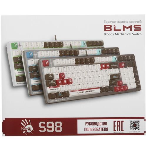 Клавиатура механическая проводная A4Tech Bloody S98 серого цвета является классической. Она подойдет для любителей играть в видеоигры. Модель имеет RGB подсветку клавиш, цвет которой можно легко поменять. Шумоизоляция корпуса позволяет снизить шум от нажатия клавиш.