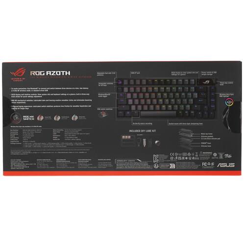 Особенность Asus ROG Azoth в RGB-подсветке и встроенном OLED-дисплее, расположенном в верхнем правом углу. Он имеет удобную настроечную кнопку, отображает пользовательские изображения и разную информацию, полезную для пользователя. Клавиатура предлагает режим для MacOS, подключается тремя способами ‒ через радиоканал, Bluetooth-канал и USB-кабель. Боковая кнопка на панели позволяет быстро и легко изменять настройки. Благодаря двум комплектам ножек можно регулировать углы наклона корпуса.