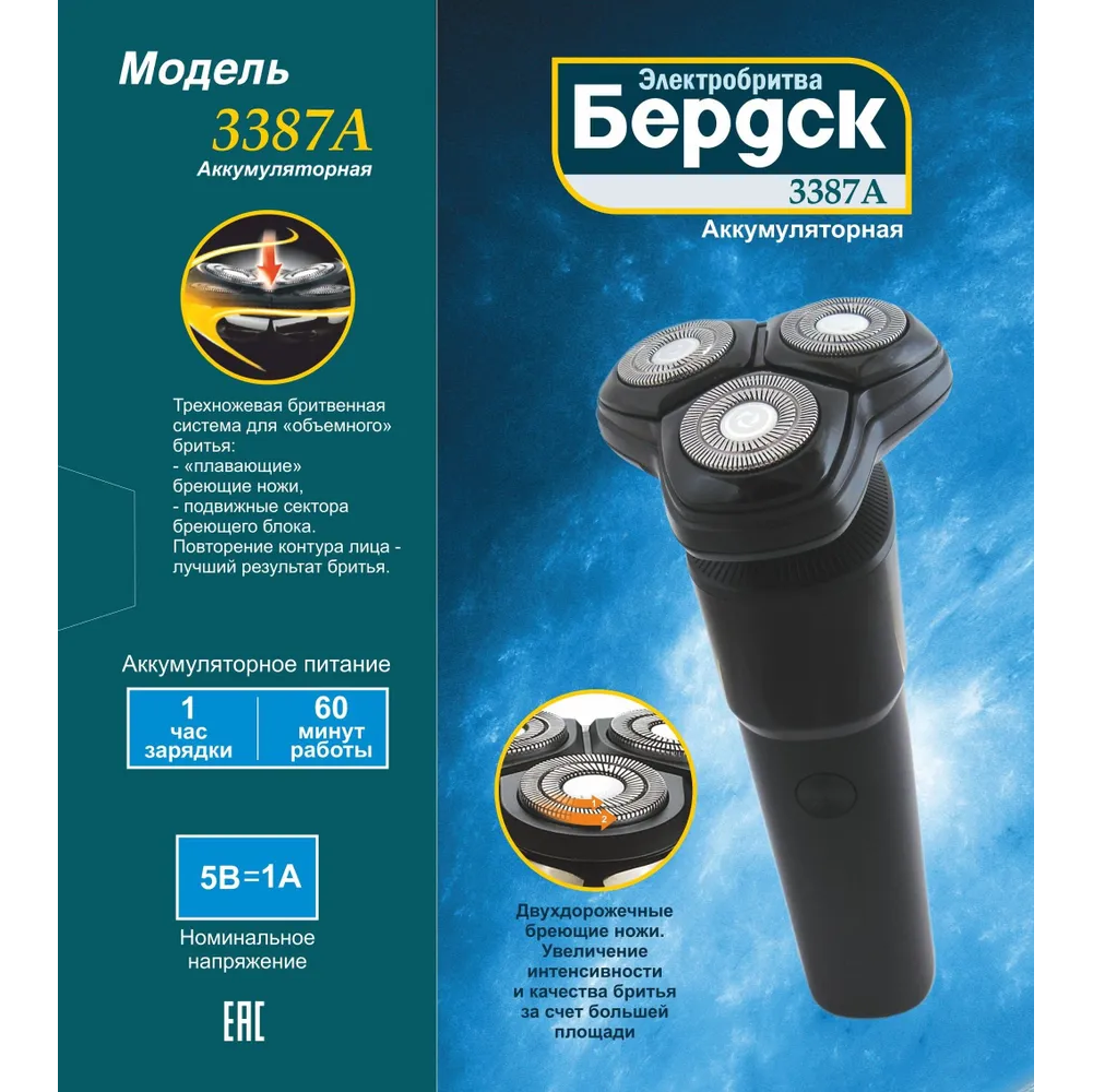 Электробритва "БЕРДСК" модель 3387А - электроприбор личной гигиены, предназначенный для сухого бритья. Прибор предназначен для использования в домашних условиях.