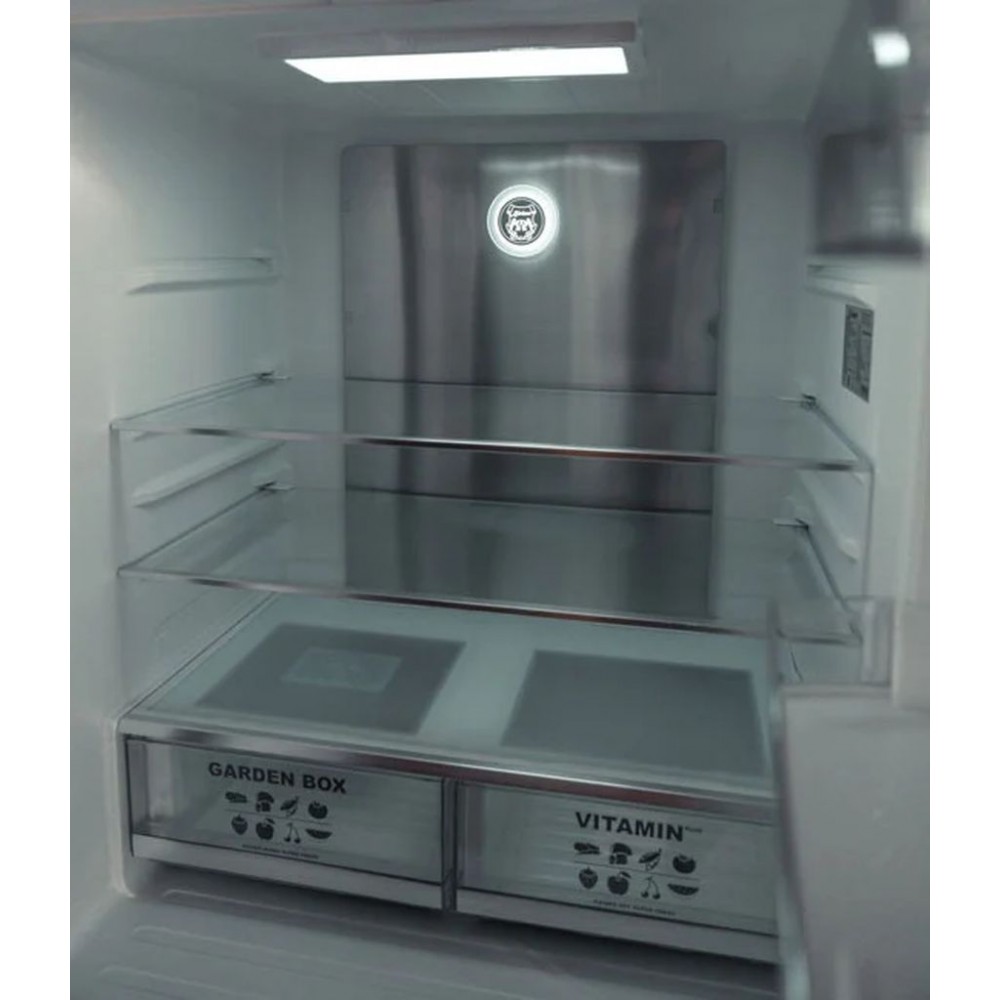 Внутренняя организацияВертикально регулируемые полки с высококачественным защитным стеклом : 2 Бокс для овощей /фруктов : 4 Выдвижные контейнеры МУЛЬТИБОКС : 8 Дверные отсеки : 3 Лотки для яиц : 1 Морозилка:Выдвижные ящики морозильной камеры : 2 Полки: 5 Коробка для супер-льда : 1