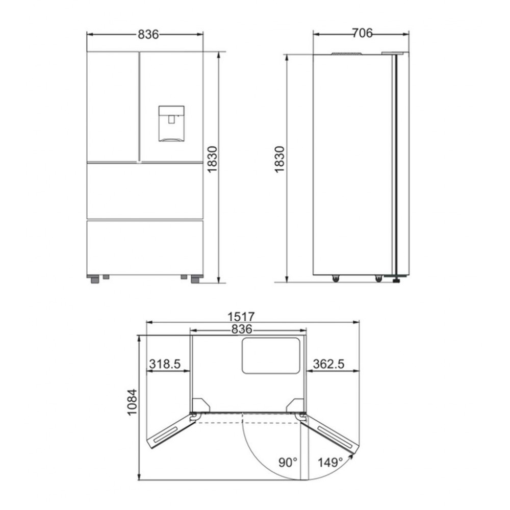 Минимальные размеры для встраивания (ШxГxВ), мм836/706/1830
