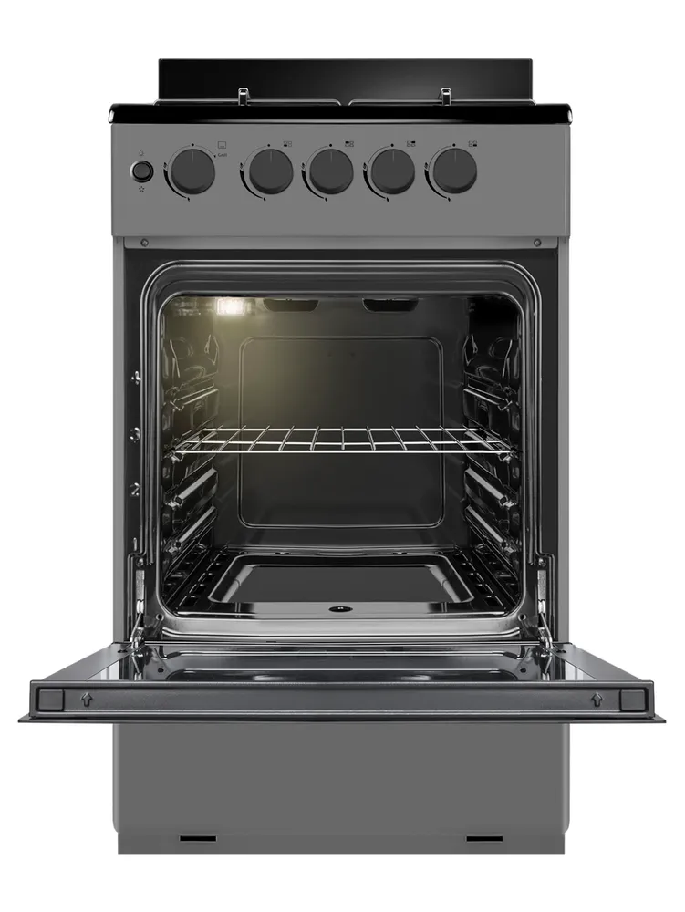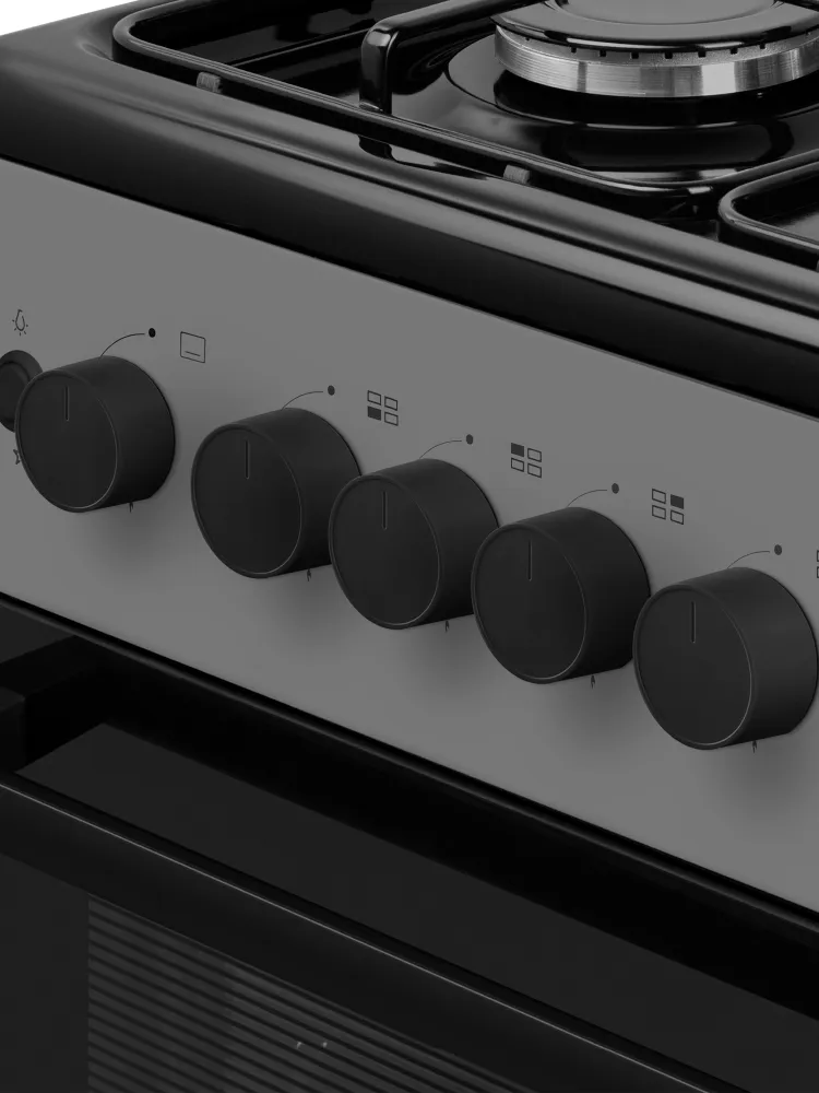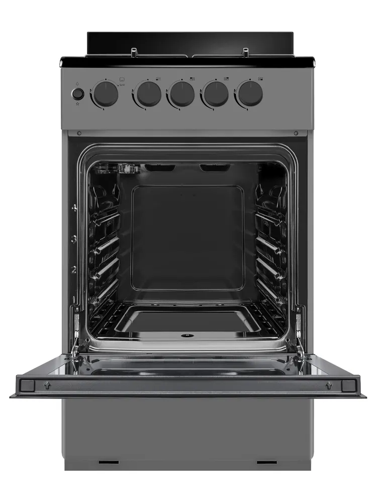 Современная газовая плита премиум-класса с электрическим грилем и газовой духовкой. Модель отличается стильным дизайном в серых тонах, расширенной функциональностью и системами безопасности, обеспечивающими комфорт и надежность при ежедневном использовании.