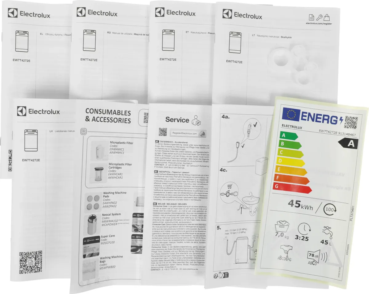 Electrolux EW7T4272E относится к классу энергопотребления A. Расход воды составляет всего 41 литр за цикл. Это делает ее экономичной в использовании.