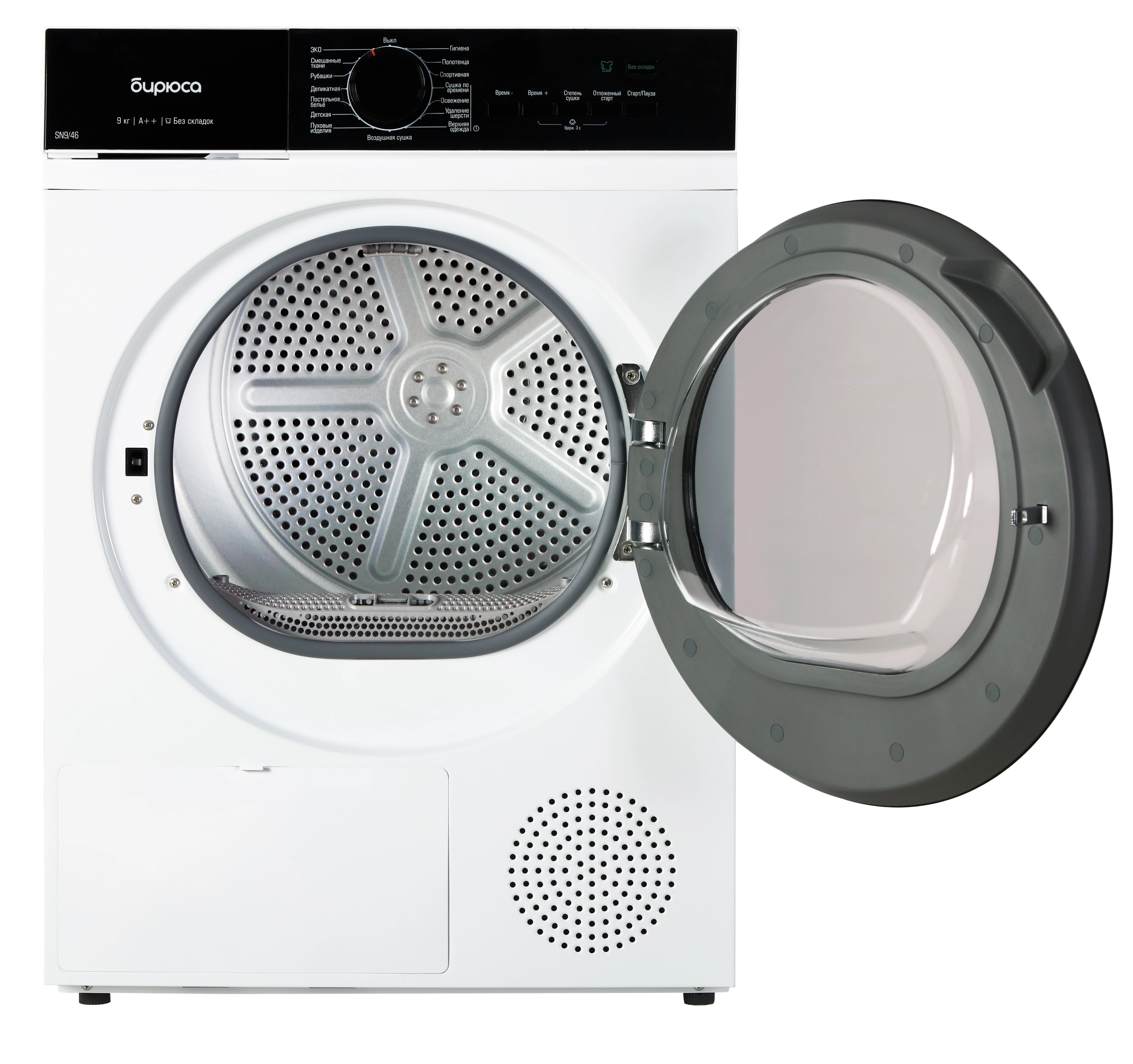 БИРЮСА DM-SN9/46 оснащена тепловым насосом, который обеспечивает более мягкую и эффективную сушку, чем традиционные сушильные машины. Алюмоцинковый барабан прочен и долговечен. Это гарантирует долгий срок службы устройства.