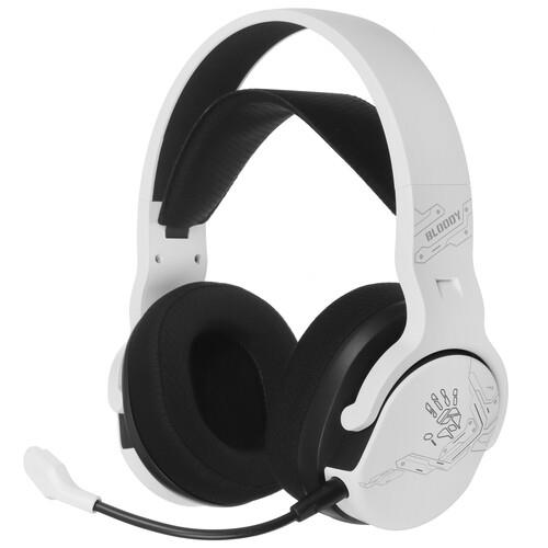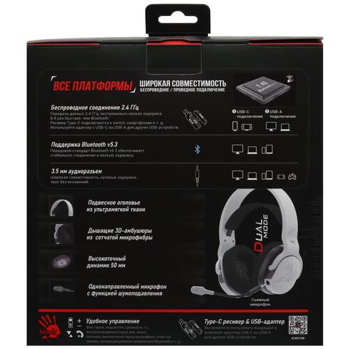 A4Tech Bloody G437 - игровые наушники с тремя способами подключения: радиоканал, Bluetooth и проводным. Съемным гибким микрофоном, большими мягкими амбушюрами и семи цветной подсветкой. Время работы наушников от одного заряда емкого аккумулятора составляет 45 часов с выключенной подсветкой и 25 часов если подсветка включена.