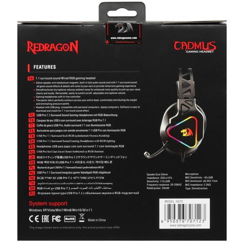 Наушники Redragon Cadmus подключаются по кабелю с разъемом USB. Чаши украшены элементами со светодиодной подсветкой RGB. Сдвоенное оголовье с регулировкой положения и мягкие амбушюры обеспечивают комфорт в играх и при прослушивании мультимедиа.
