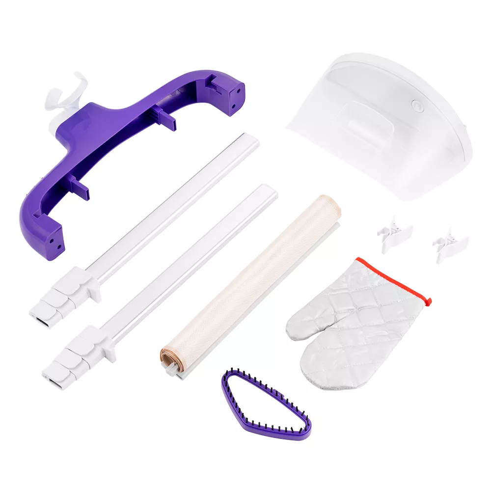Комплектация 1. Отпариватель с паровым шлангом и утюжком — 1 шт. 2. Резервуар для воды — 1 шт. 3. Телескопическая стойка — 2 шт. 4. Вешалка с держателем утюжка — 1 шт. 5. Ворсовая щетка — 1 шт. 6. Прищепка для одежды — 2 шт. 7. Защитная варежка — 1 шт. 8. Руководство по эксплуатации — 1 шт. 9. Коллекционный магнит — 1 шт.* *опционально