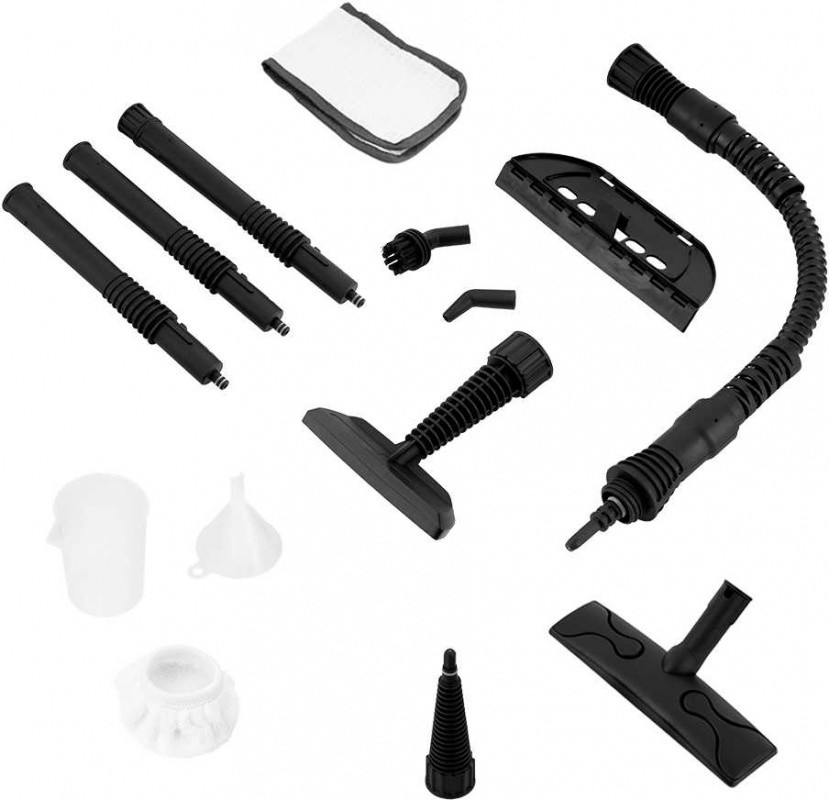 Насадки в комплекте: скребок для стекла, угловая насадка, удлинительная трубка, круглая нейлоновая щетка, паровой шланг, щетка для пола, тряпка для пола, тряпка для отпаривания, струйная насадка,