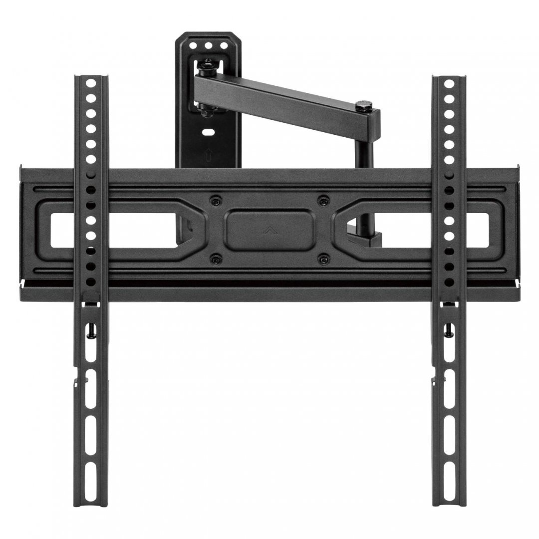 Кронштейн для телевизора Kivi Motion-443A оснащен пластиной с отверстиями, которая обеспечивает надежную фиксацию на стену посредством резьбового крепежа. Модель предназначена для устройства с диагональю 32-55 дюймов весом до 35 кг. Кронштейн имеет регулировочный механизм, который позволяет изменять угол наклона телевизора в диапазоне от +3 до -15° и угол поворота +/-90°. Телевизор фиксируется с помощью планок, расстояние между которыми изменяют. Благодаря этому обеспечено надежное положение устройства без риска повреждения корпуса. Модель позволяет отодвинуть устройство от стены на расстояние до 430 мм. Для удобного монтажа имеются встроенный кабель-канал и пузырьковый уровень на корпусе.