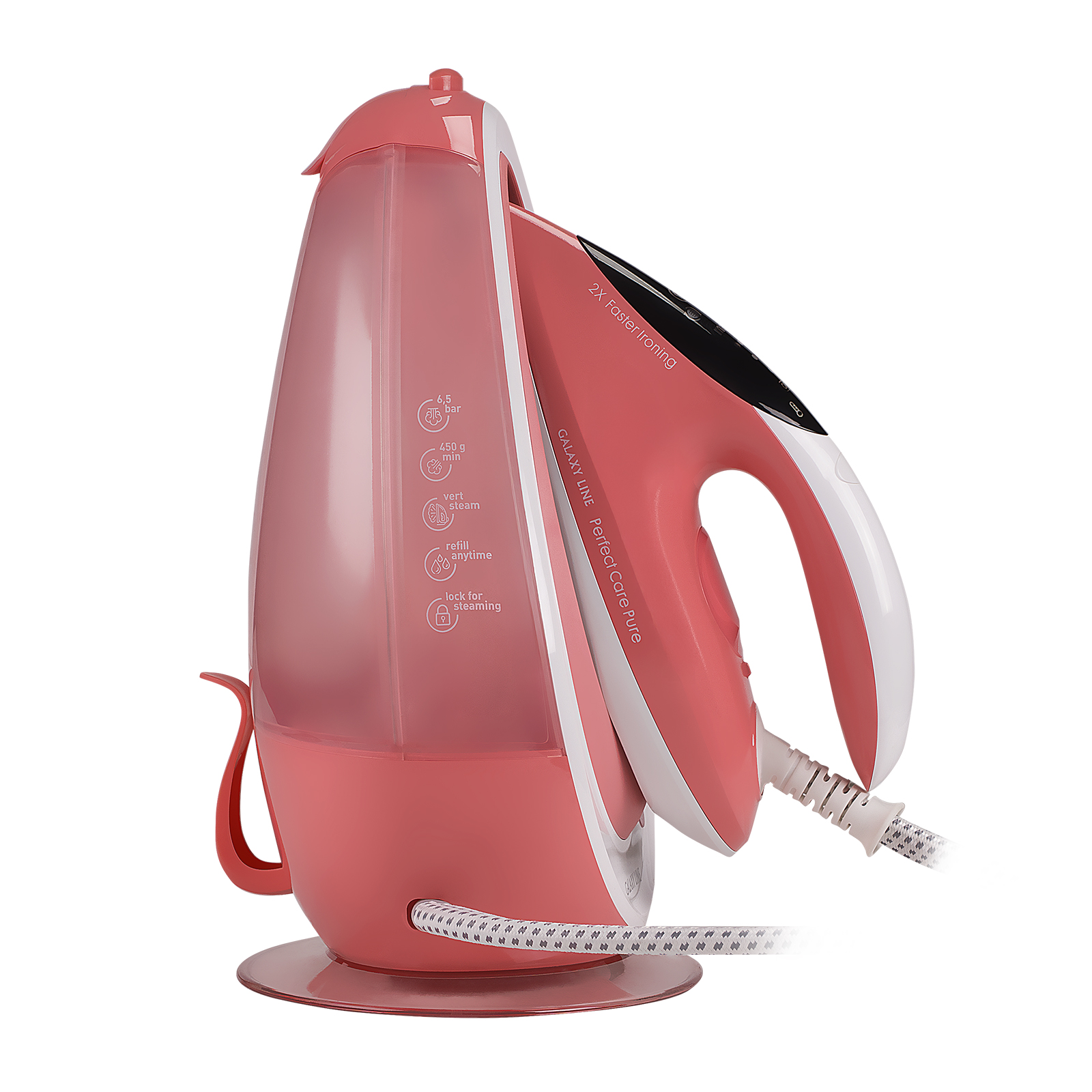 В комплекте: утюг, база, мерный стакан, запасной сменный фильтр для сбора накипи, руководство по эксплуатации
