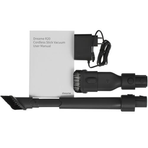 Две сменные насадки-щетки с вращающимся валиком предназначены для ухода за гладкими напольными покрытиями и коврами. Дополнительно в комплекте поставляются насадки для мебели и труднодоступных мест. На встроенном LED-дисплее отображается статус уборки. Аккумулятор емкостью 2900 мА*ч гарантирует до 90 минут автономной работы Dreame R20.