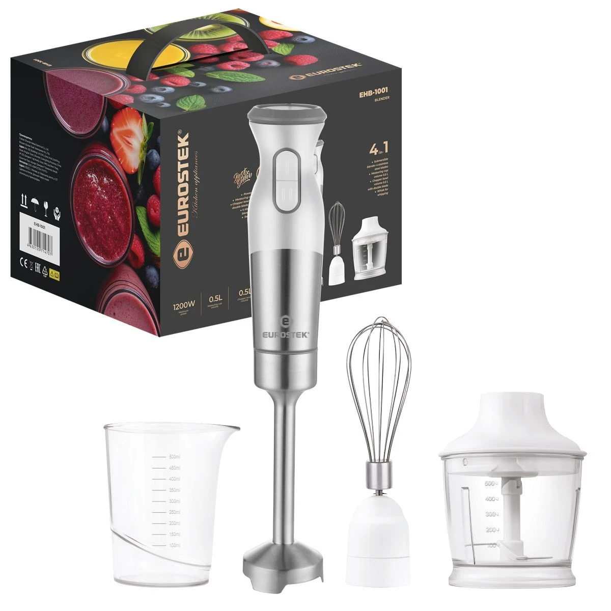 Мощность 1200 Вт, низкий уровень шума, 2 скорости, стальной нож, мерный стакан - 500мл, стальной венчик, измельчитель - 500мл
