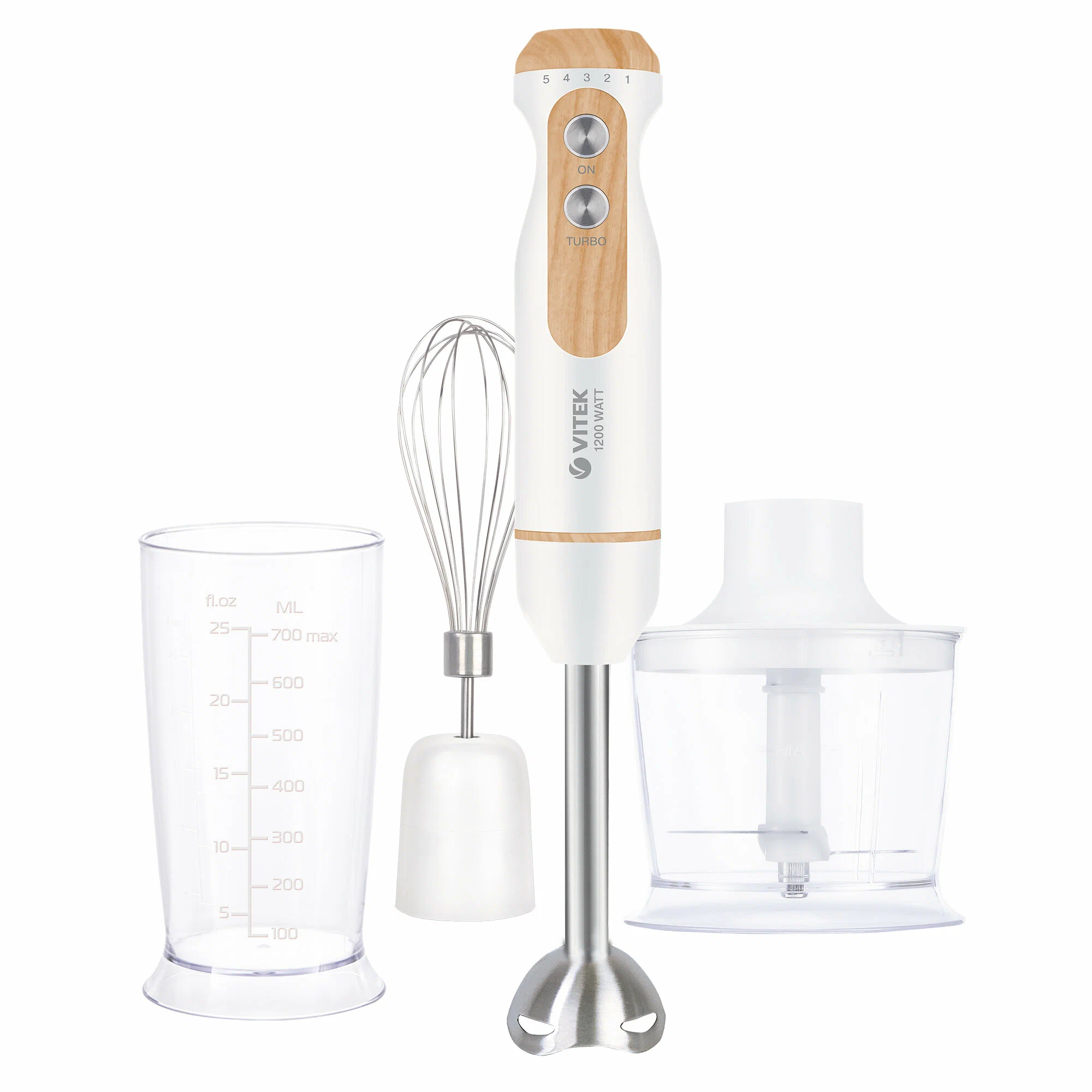 Комплектация блендер-1; венчик-1; насадка-чоппер-1; мерный стакан-1; измельчитель-1; нож измельчителя-1