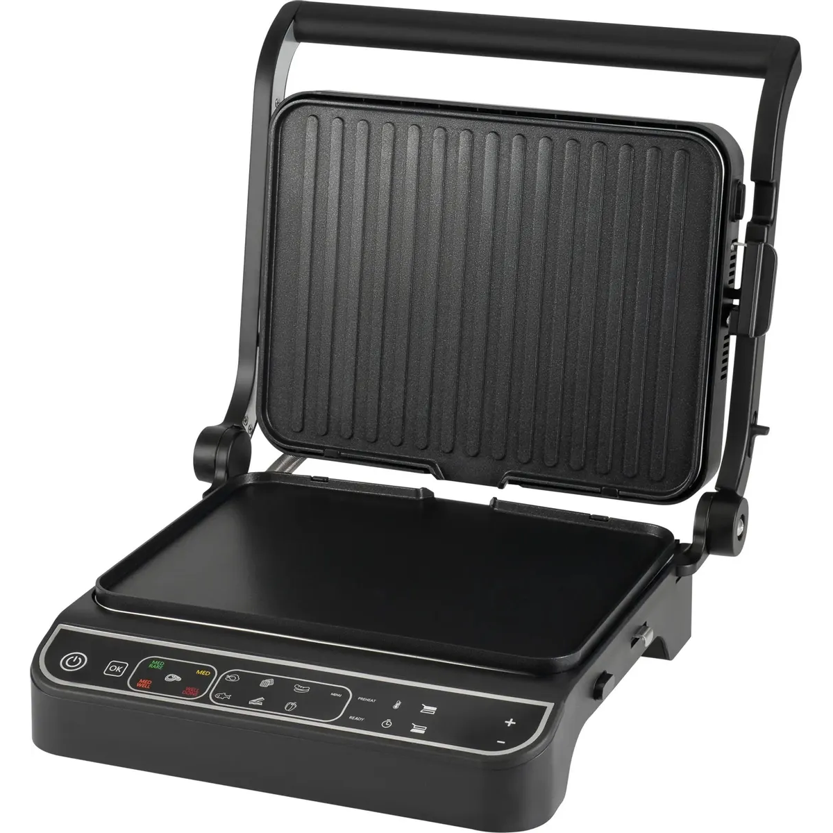 Термощуп обеспечивает автоматический контроль температуры внутри стейка, тем самым контролирует степень прожарки. 10 автоматических программ для приготовления, а так же ручной режим, для оптимальных настроек для каждого типа продуктов. Открытие на 180°, плоская панель и раздельная регулировка температуры панелей, позволяет использовать гриль как плиту.