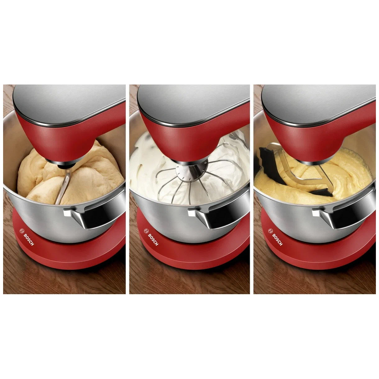 Основные характеристикиБрендBOSCHЦвет товаракрасныйТипкухонная машинаМощность1600 ВтЕмкость чаши5.5 лКоличество скоростей7Насадкивенчик для взбивания, для замешивания тестаЧисло насадок3СоковыжималканетДополнительные характеристикиОсобенностиимпульсный режим, режим турбоОсобенности конструкциизащитная крышка на чашуМатериал чашинержавеющая стальМатериал корпусаметаллДлина сетевого шнура1.4 мАксессуары в комплектекрышка для защиты от брызгПодробная комплектацияКухонная машина, венчик с силиконовым покрытием, объемный венчик для взбивания (с регулировкой высоты), крюк для теста.Дополнительная информациявенчик с силиконовым покрытием, объемный венчик для взбивания (с регулировкой высоты)
