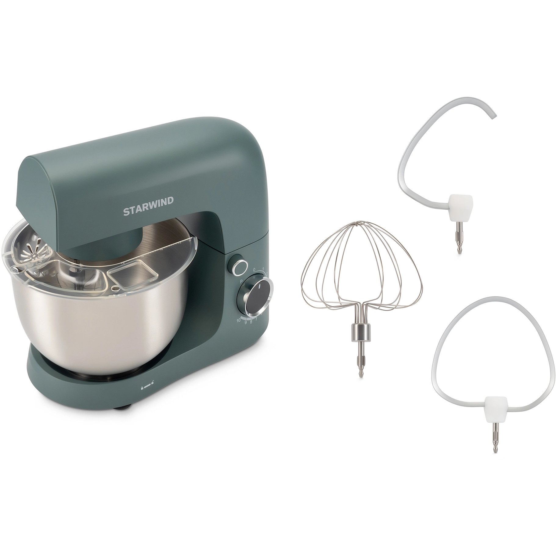 Комплектация Миксер; насадка-крюк; насадка-венчик; насадка-лопатка; инструкция с гарантийным талоном; книга рецептов; мультифункциональный защитный обод