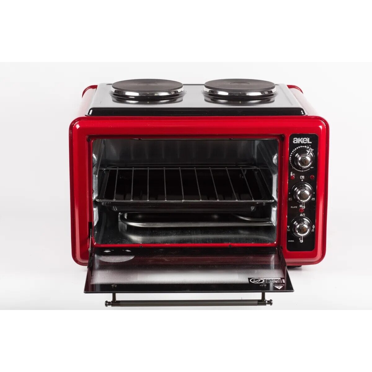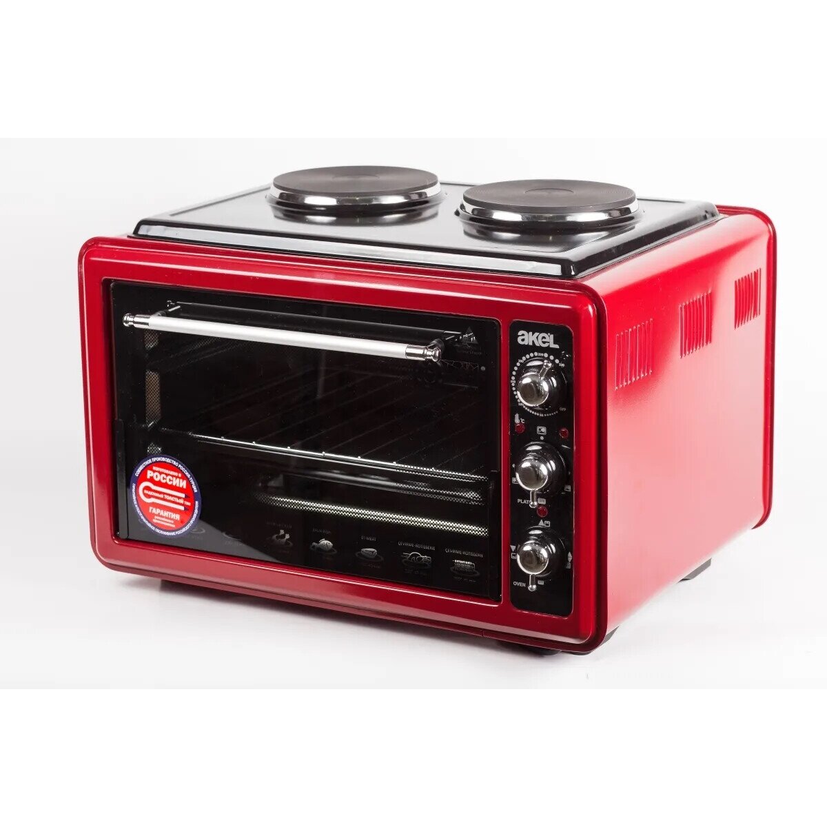 * Производитель: Akel * Цвет: красный * Тип прибора: мини-печь * Внутренний объем: 36л * Максимальная мощность: 3300Вт * Количество конфорок: 2 * Максимальная температура: 250°С * Количество режимов работы: 3 * Конвекция: Нет * Гриль: Нет * Вертел: Нет * Внутреннее покрытие камеры: эмаль * Открытие двери: откидное * Управление: механическое * Дисплей: Нет * Таймер: Да * Максимальное время таймера: 60мин * Особенности: защита от перегрева индикатор работы подсветка камеры ручка с защитой от нагревания термоизолированый корпус функция разогрева * Комплектация: круглый противень прорезиненные ножки противень решетка * Ширина: 60см * Глубина: 30см * Высота: 44см * Вес: 11.5кг