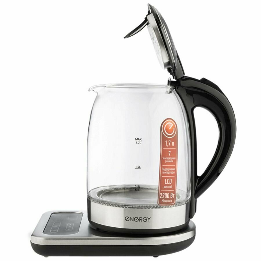 Чайник ENERGY e-220e 1.7 л стекло, на подставке 164150 предназначен для использования в офисе или дома.