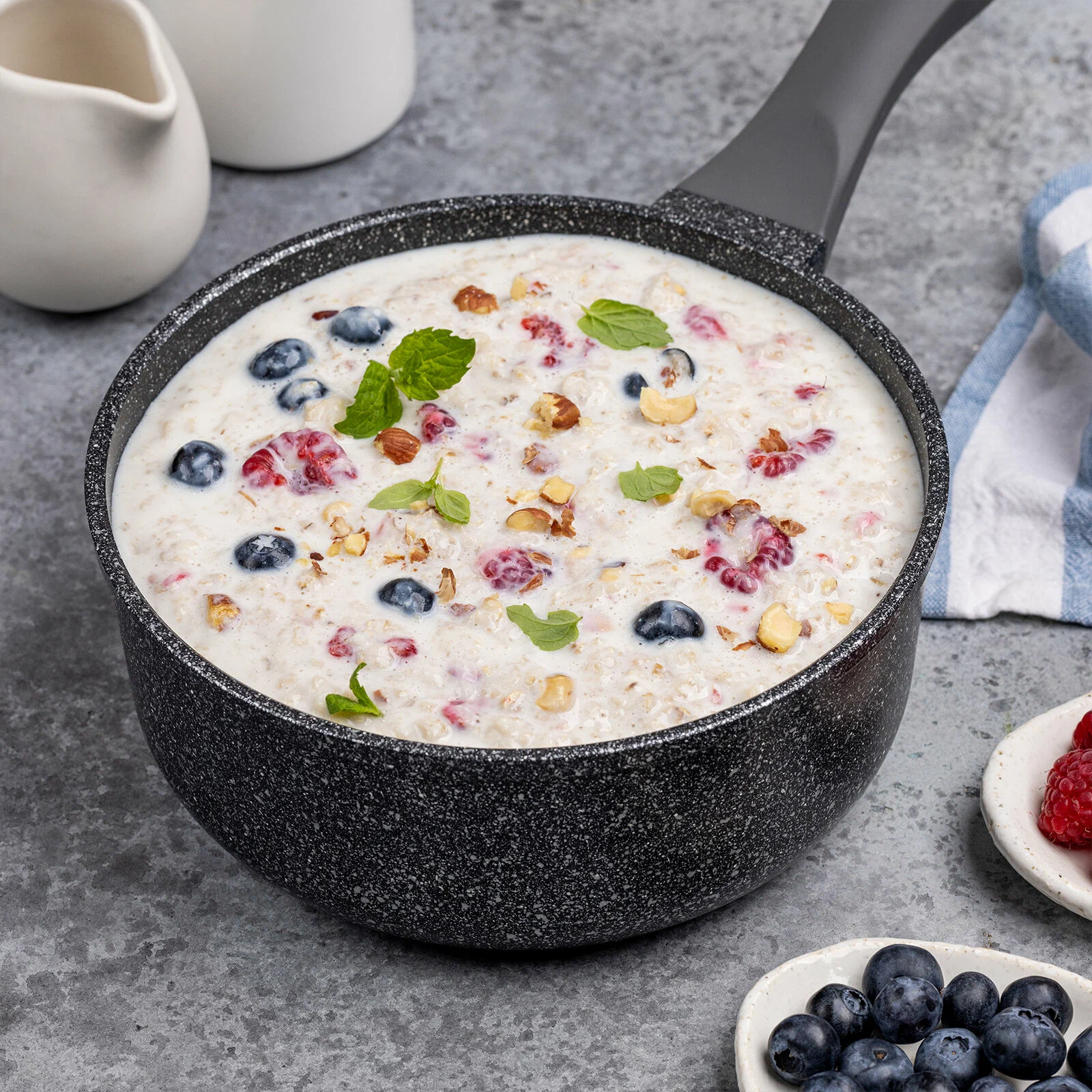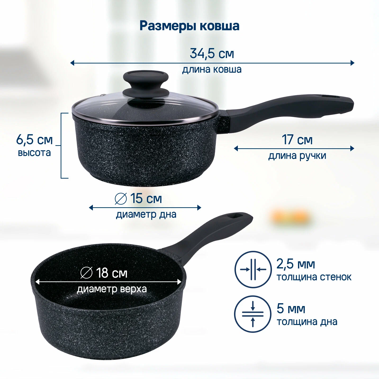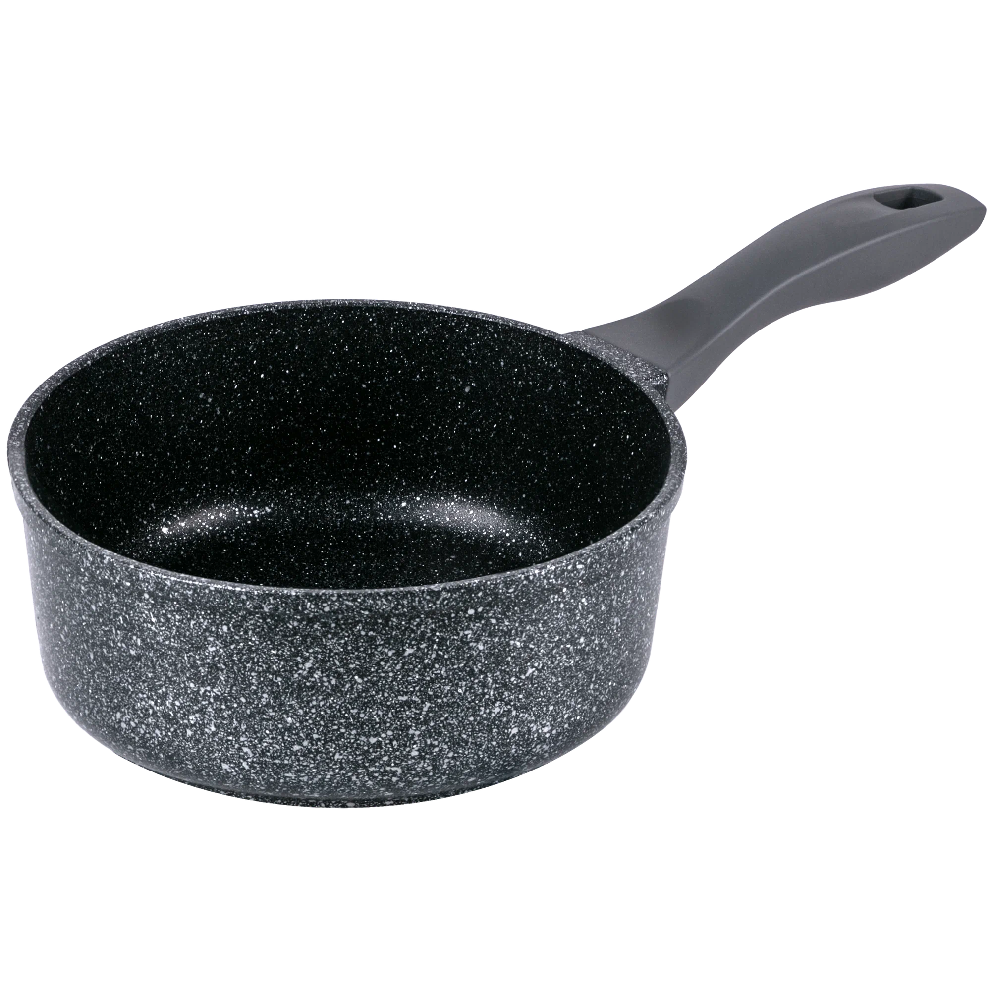 Ковш с эффектным мраморным покрытием и современной ручкой в универсальном сером цвете, будет отлично сочетаться с любой кухней.