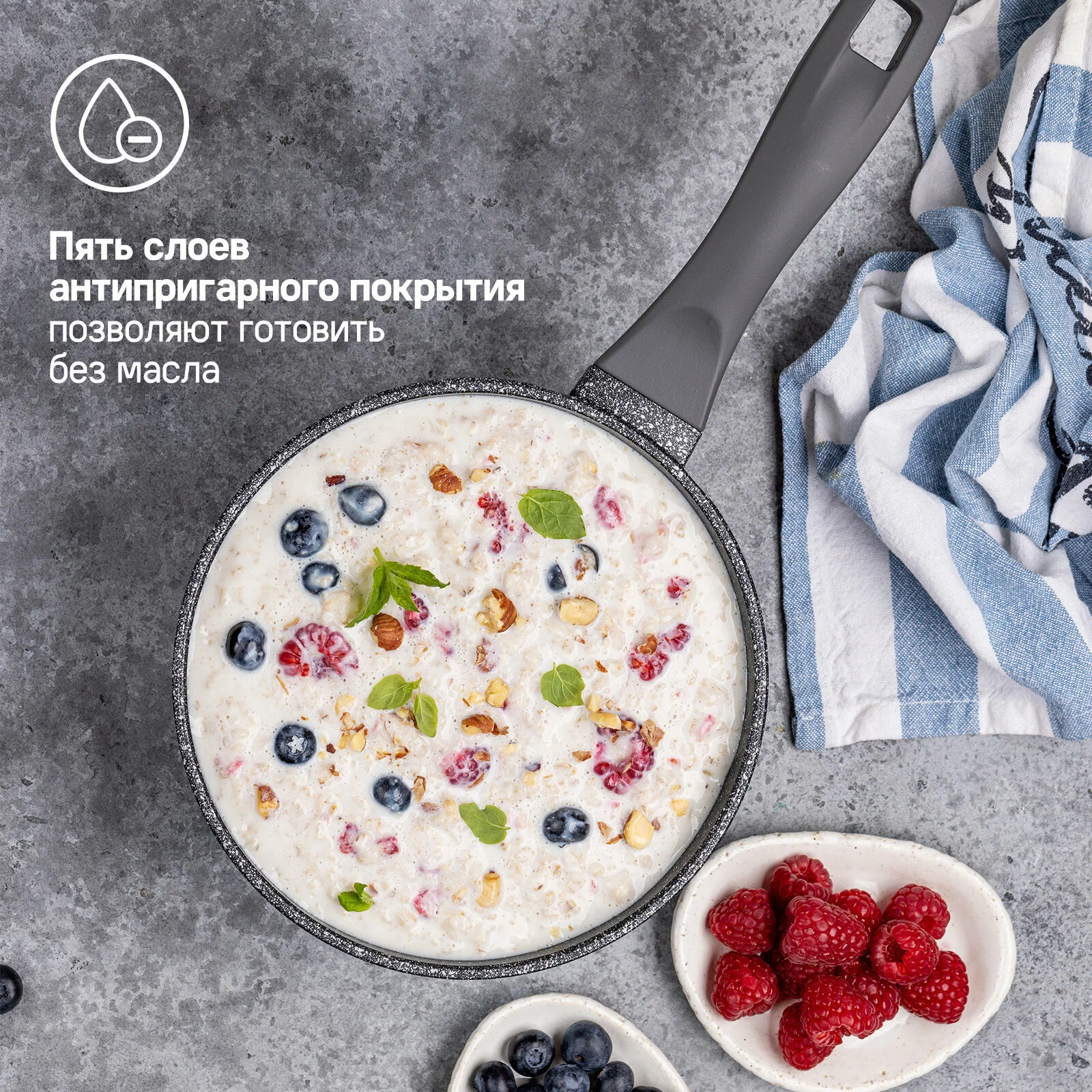 Пять слоев безопасного антипригарного покрытия, не меняет вкус и аромат еды, можно готовить с небольшим количеством масла или готовить без масла, делая еду диетической - специально для поклонников здорового образа жизни.